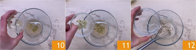 Fügen Sie auch den Agavensirup hinzu 10, den frisch geriebenen Ingwer 11, das Salz und das Wasser 12.