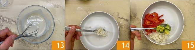 Verwenden Sie einen Schneebesen, um alles gut zu vermischen 13. Sie können Ihre Poke Bowl zusammenstellen, indem Sie den gekochten und wieder auf Zimmertemperatur abgekühlten Reis 14 einfüllen. Fügen Sie dann Paprika und Avocado hinzu 15.