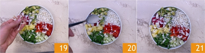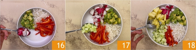 Fahren Sie mit den Radieschen 16, den gewürfelten Gurken 17 und der Ananas fort 18.