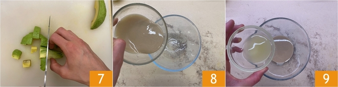 Schälen und schneiden Sie zuletzt die Avocado in Stücke 7 und bereiten Sie die Sauce vor. Geben Sie die Tahini-Sauce in eine Schüssel 8, fügen Sie dann den Zitronensaft hinzu 9.