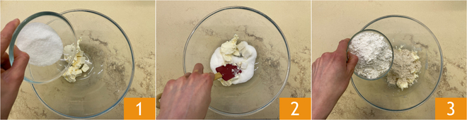 Um die vegane Tarte zuzubereiten, beginnt ihr mit dem Teig für den veganen Mürbeteig: In einer Schüssel die vegane Margarine mit dem Zucker 1 geben und mit einem Gummispatel verrühren, bis alles verbunden ist 2. Wenn eine cremige Masse entstanden ist, das Weizenmehl Type 1 und das Kastanienmehl hinzugeben 3.
