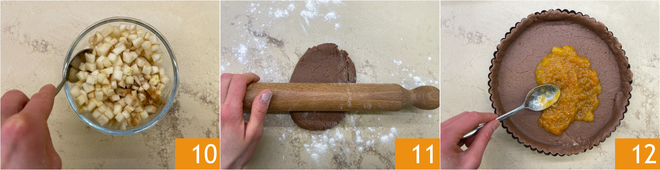 Der vegane Mürbeteig, zubereitet mit Weizenmehl Type 1 und Kastanienmehl, Vegan Butter und Haferdrink, hat eine kompakte, aber zarte Konsistenz und wird durch eine leichte Kakaonote verfeinert. Heraus kommt eine knusprige Hülle, die eine Füllung aus zimtduftenden Birnen mit Zitronenschale aufnimmt, ergänzt durch eine Konfitüre nach Wahl für einen noch verlockenderen Geschmack.
