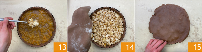 Die Birnenwürfel hinzufügen 13 und die zweite Teigplatte darüberlegen 14. Die Ränder gut andrücken, damit alles dicht verschlossen ist 15.