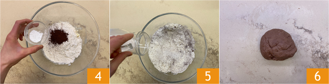Fahrt mit Kakao und Backpulver fort 4, dann kurz umrühren und den Haferdrink zugießen 5. Von Hand kneten, bis ein Teig entsteht, den Teigling in Frischhaltefolie wickeln und etwa eine Stunde im Kühlschrank ruhen lassen 6.