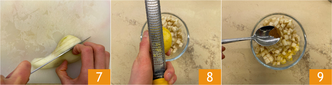 In der Zwischenzeit die Birnen schälen und putzen; ihr benötigt 450 g Fruchtfleisch, das ihr in etwa 1 cm große Würfel schneiden sollt 7. Die Birnen in eine Schüssel geben und mit abgeriebener Zitronenschale 8 und Zimt 9 aromatisieren.