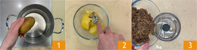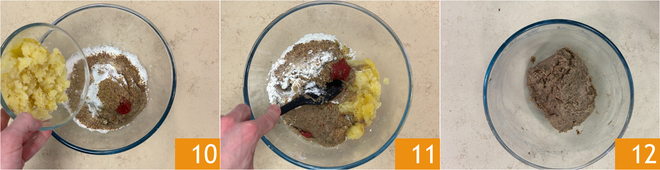Fügen Sie nun die gekochte Kartoffel 10 hinzu, salzen, pfeffern und mischen Sie gut mit einem Spatel 11, bis die richtige Konsistenz erreicht ist 12.<\/p>