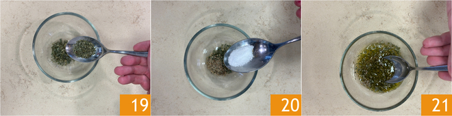 Bereiten Sie das Dressing vor: In eine Schüssel Thymian und Rosmarin 19 geben, Salz 20 und Öl hinzufügen und mischen 21.<\/p>
