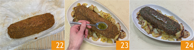 Danach ist der Hackbraten fertig 22, bestreichen Sie die Oberfläche mit dem frisch zubereiteten Dressing 23 und servieren Sie Ihren veganen Hackbraten mit den Kartoffeln 24.<\/p>