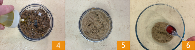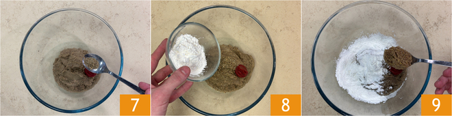 Dann die Kräuter 7, das Tomatenmark und die Maisstärke 8 und schließlich die zu Pulver zerkleinerten Leinsamen 9.<\/p>