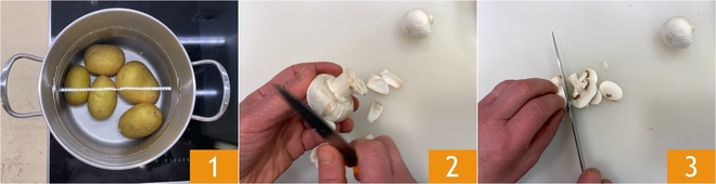 Um den veganen Kartoffelauflauf zuzubereiten, waschen Sie zunächst die Kartoffeln gründlich. Dann legen Sie sie ungeschält in einen Topf mit reichlich kaltem, gesalzenem Wasser 1. Bringen Sie das Wasser zum Kochen und lassen Sie die Kartoffeln 35–40 Minuten garen. In der Zwischenzeit kümmern Sie sich um die Füllung. Blanchieren Sie zuerst die Erbsen für wenige Minuten. Nehmen Sie dann die Pilze, entfernen Sie mit einem Messer die erdigen Stellen 2 und schneiden Sie sie anschließend in Scheiben 3.