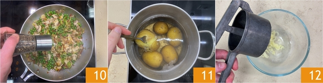Schmecken Sie mit Salz und Pfeffer ab 10; fügen Sie Majoran hinzu und nehmen Sie die Pfanne vom Herd. Zu diesem Zeitpunkt sollten die Kartoffeln gar sein. Prüfen Sie dies, indem Sie sie mit einer Gabel einstechen 11. Gießen Sie das Wasser ab, lassen Sie die Kartoffeln etwas abkühlen und drücken Sie sie dann noch heiß mit einer Kartoffelpresse durch 12, dabei die Püreemasse in eine Schüssel geben.