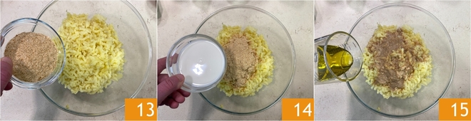 Geben Sie zu den zerstampften Kartoffeln die Nährhefeflocken 13, den Haferdrink 14 und das Olivenöl extra vergine 15.