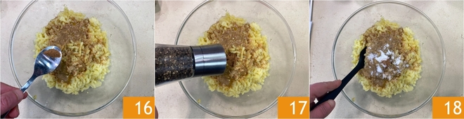 Fügen Sie außerdem Muskatnuss 16, Salz und Pfeffer hinzu 17. Vermengen Sie alles gut mit einem Spatel 18.