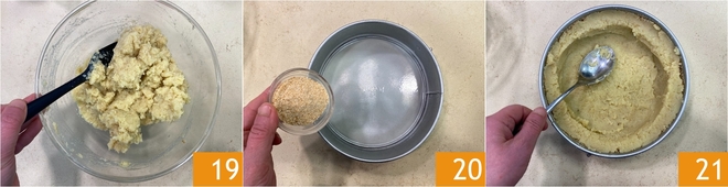 Sie sollten eine cremige und homogene Masse erhalten 20. Fetten Sie eine runde Form mit 22 cm Durchmesser ein und bestreuen Sie den Boden mit Semmelbröseln 20. Geben Sie die Hälfte der Kartoffelmasse hinein und drücken Sie sie mit der Rückseite eines Löffels so an, dass die Ränder etwas dicker werden 21, wodurch eine Mulde für die Füllung entsteht.