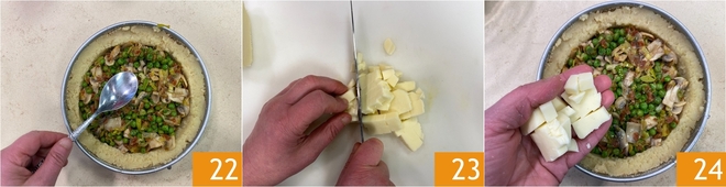 Geben Sie die gesamte Füllung hinein und verteilen Sie sie gleichmäßig 22, schneiden Sie den Käse in Stücke 23 und legen Sie ihn über das Gemüse 24.