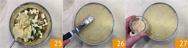 Decken Sie die Füllung mit der restlichen Kartoffelmasse ab 25, glätten Sie die Oberfläche vorsichtig 26 und bestreuen Sie alles mit Semmelbröseln 27.
