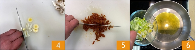 Nehmen Sie den Lauch, entfernen Sie die äußeren Blätter und schneiden Sie ihn in feine Ringe 4. Hacken Sie außerdem die getrockneten Tomaten grob mit einem Messer 5. Erhitzen Sie in einer Pfanne das Olivenöl extra vergine und geben Sie den in feine Ringe geschnittenen Lauch dazu 6.