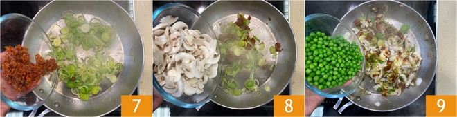 Fügen Sie die getrockneten Tomaten hinzu 7 sowie die in Scheiben geschnittenen Pilze 8. Geben Sie schließlich die blanchierten Erbsen dazu 9 und lassen Sie alles 5–10 Minuten schmoren.