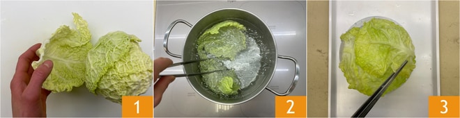 Um die vegetarischen Wirsingrouladen zuzubereiten, nehmen Sie den Wirsing und entnehmen Sie die 10 größten und zartesten Blätter 1. Kochen Sie die Blätter in reichlich Salzwasser für 3 Minuten 2, lassen Sie sie abtropfen und kühlen Sie sie ab, indem Sie sie auf eine umgedrehte Schüssel auf dem Tisch legen 3.
