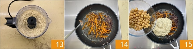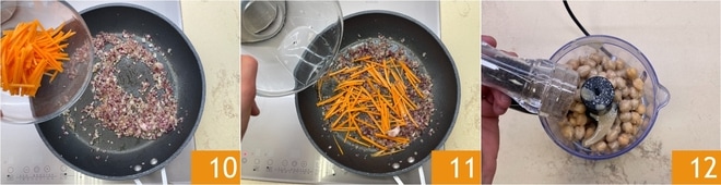 Fügen Sie die Karotten 10, das Salz, einen Schuss Wasser 11 hinzu und kochen Sie für 8 Minuten. In der Zwischenzeit pürieren Sie die Hälfte der vorgekochten Kichererbsen zusammen mit der Tahina, Salz und Pfeffer 12.