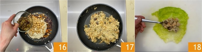 Fügen Sie auch die Oliven hinzu 16 und lassen Sie die Mischung gut trocknen, sie sollte weich aber ausreichend fest sein 17. Füllen Sie die Wirsingblätter mit der Kichererbsenfüllung 18.