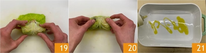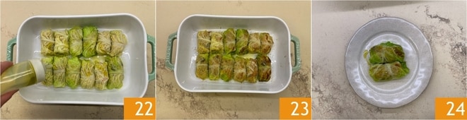 Würzen Sie mit Salz, Pfeffer und Öl 22. Backen Sie im vorgeheizten Umluftofen bei 180 Grad für 20 Minuten. Servieren Sie die Rouladen mit einem Schuss Öl: die vegetarischen Wirsingrouladen sind bereit zum Servieren 24!