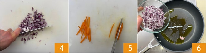 Schälen und hacken Sie die Zwiebel 4. Schälen und schneiden Sie die Karotten in Julienne-Streifen 5. Erhitzen Sie in einer Pfanne einen Schuss Öl mit dem Knoblauch 6.