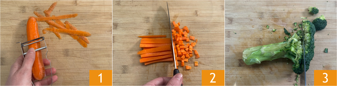 Um die Gemüse-Burger zuzubereiten, schälen Sie zuerst die Karotten 1 und schneiden Sie sie zuerst in Streifen und dann in Würfel von etwa 5-7 mm 2. Trennen Sie die Brokkoliröschen 3.