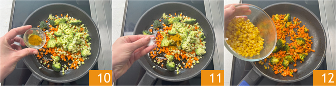 Fügen Sie dann das Curry hinzu 10, würzen Sie mit Salz 11 und kochen Sie bei mittlerer bis hoher Hitze etwa 10 Minuten. Fügen Sie den Mais hinzu 12.