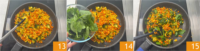 Entfernen Sie den Knoblauch 13 und fügen Sie den Spinat hinzu 14. Sobald dieser verwelkt ist, lassen Sie ihn weitere 5 Minuten kochen 15.