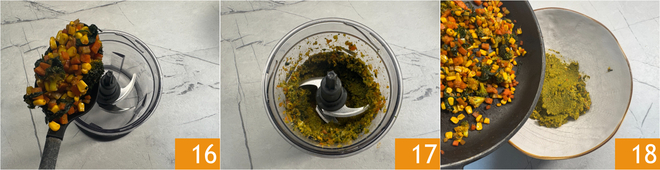 Geben Sie die Hälfte des Gemüses in einen Mixer 16 und pürieren Sie es, bis Sie eine homogene Masse erhalten 17. Geben Sie es dann in eine Schüssel und fügen Sie das restliche Gemüse hinzu 18.