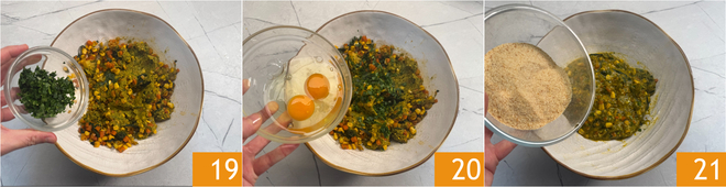 Duften Sie mit Petersilie ab 19, dann fügen Sie die Eier hinzu 20 und mischen Sie. Zuletzt fügen Sie die Semmelbrösel hinzu 21.