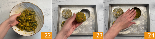 Mischen Sie erneut, bis Sie eine formbare Masse erhalten 22. Mehlen Sie ein Tablett, auf dem Sie Ihre Burger formen möchten. Nehmen Sie mit leicht feuchten oder geölten Händen 90 g Masse und formen Sie eine große Kugel 23. Legen Sie sie in einen Ausstechring mit einem Durchmesser von 8 cm und drücken Sie sie zu einem Medaillon 24, alternativ können Sie sie frei von Hand formen.