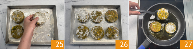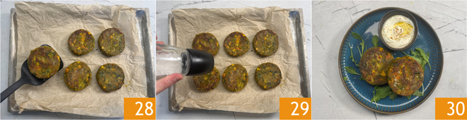 Nach dem Braten legen Sie sie auf saugfähiges Papier, um überschüssiges Öl zu entfernen 28, und würzen Sie sie mit einer Prise Salz 29. Ihre Gemüse-Burger sind bereit, genossen zu werden 30: servieren Sie sie zum Beispiel mit Rucola und einer Joghurtsauce.