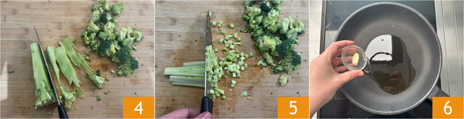 Entfernen Sie die äußeren Teile des Stiels 4 und schneiden Sie ihn zuerst in Streifen und dann in Würfel von etwa 5-7 mm 5. Geben Sie einen Spritzer Öl in eine Antihaftpfanne und fügen Sie den Knoblauch hinzu 6.
