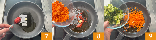 Geben Sie das Tomatenmark hinzu 7 und lassen Sie es ein paar Minuten ziehen. Fügen Sie dann die Karotten 8 und die Brokkoli hinzu 9.