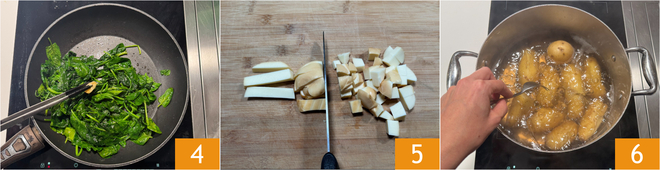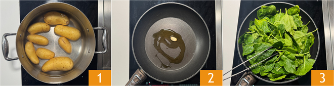 Um den vegetarischen Kartoffelauflauf zuzubereiten, setzt ihr zuerst die Kartoffeln in kaltem Wasser auf und lasst sie ab dem Aufkochen etwa 40 Minuten garen 1. In der Zwischenzeit bereitet ihr den Spinat zu: Erwärmt einen Schuss Öl in der Pfanne zusammen mit dem Knoblauch 1, dann gebt den Spinat 3 und eine Prise Salz dazu.