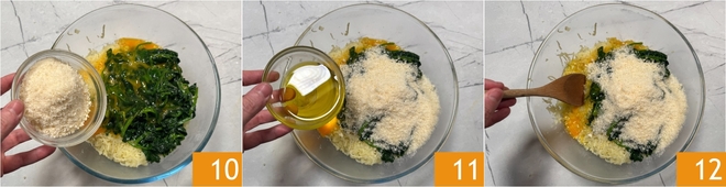 Gebt außerdem den geriebenen Käse 10 und das Öl 11 hinzu und vermengt dann alle Zutaten gut 12.
