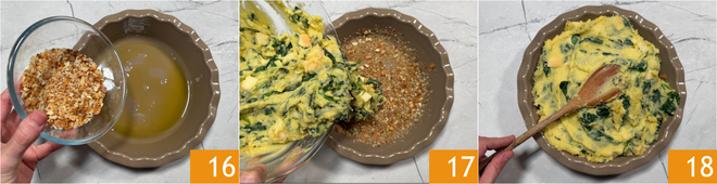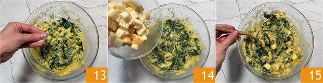 Mit Salz 13 und Pfeffer abschmecken. Zum Schluss die Scamorza-Würfel unterheben 14 und alles gut durchmischen, bis eine homogene Masse entsteht 15.