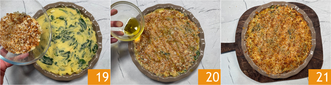 Bestreut die Oberfläche mit den restlichen Semmelbröseln 19 und beträufelt alles mit einem Schuss Öl 20. Im vorgeheizten Backofen (Ober-/Unterhitze) bei 200 °C etwa 40 Minuten backen, oder bis sich eine schöne goldbraune Kruste gebildet hat. Bei Bedarf den Grill noch für ein paar Minuten einschalten. Den vegetarischen Kartoffelauflauf aus dem Ofen nehmen und vor dem Servieren ein paar Minuten ruhen lassen 21!
