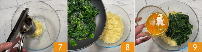 Die Kartoffeln abgießen und in einer Schüssel zerdrücken (die Schale bleibt in der Kartoffelpresse) 7. Gebt den Spinat dazu 8 und die verquirlten Eier 9.
