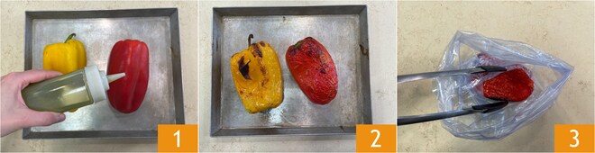 Um den vegetarischen Quinoa-Salat zuzubereiten, legen Sie die Paprika auf ein Backblech, beträufeln Sie sie mit etwas Öl 1 und massieren Sie sie, um sie gleichmäßig zu bedecken. Im vorgeheizten statischen Ofen bei 200° für 30 Minuten backen, sie sollten gut geröstet sein. Dann legen Sie sie, noch heiß, in einen Lebensmittelbeutel und lassen Sie sie 10 Minuten ruhen 3.