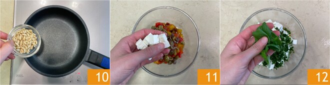 Rösten Sie die Pinienkerne in einer Pfanne 10. Geben Sie in die Schüssel mit den Paprika auch den Feta, die Oliven, die gehackten Kräuter und fügen Sie Basilikum und Minze in kleinen Stücken von Hand hinzu 12.
