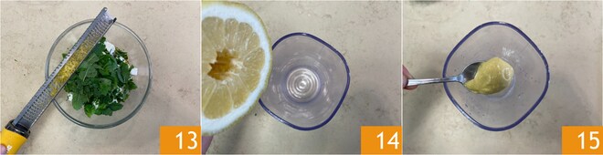 Aromatisieren Sie mit der Schale einer halben Zitrone 13. Beiseite stellen Sie das Dressing und bereiten Sie die Zitronensauce vor: In einem hohen Glas geben Sie den Saft einer Zitrone 14 und den Senf 15.