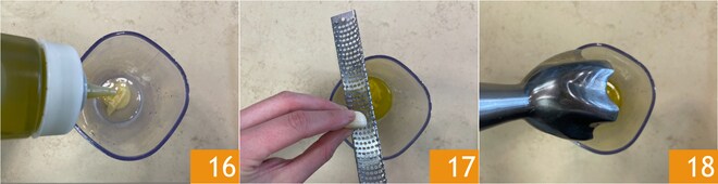 Fügen Sie auch das Öl 16 und eine halbe gehackte Knoblauchzehe hinzu 17. Mixen Sie alles mit dem Stabmixer, um eine Emulsion zu erhalten 18.