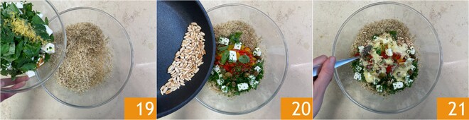 Jetzt würzen Sie die Quinoa mit den Zutaten in der Schüssel 19, den gerösteten Pinienkernen 20 und der Zitronensauce 21. Mischen Sie, um Geschmack zu verleihen.