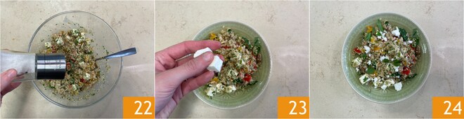 Mit Salz und Pfeffer abschmecken 22. Servieren Sie nach Belieben mit zerbröckeltem Feta 23. Der vegetarische Quinoa-Salat ist fertig zum Genießen 24.
