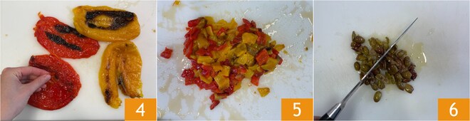Jetzt können Sie die Haut leicht entfernen, zusammen mit den Samen und dem Stiel 4. Schneiden Sie sie in Stücke 5 und legen Sie sie in eine Schüssel. Schneiden Sie die Oliven grob 6.