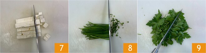 Schneiden Sie den Feta in Würfel 7. Hacken Sie den Schnittlauch 8 und die Petersilie 9.