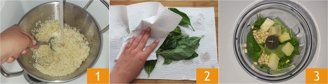 Um den vegetarischen Reissalat zuzubereiten, kochen Sie zuerst den Reis in reichlich gesalzenem, kochendem Wasser bissfest. Spülen Sie ihn unter fließendem Wasser ab, um die Garzeit zu stoppen 1, und lassen Sie ihn dann mindestens 30 Minuten abtropfen, dabei gelegentlich umrühren. In der Zwischenzeit widmen Sie sich dem Pesto: Spülen Sie die Basilikumblätter vorsichtig ab und tupfen Sie sie mit Küchenpapier trocken 2, dann geben Sie sie zusammen mit dem Öl, den Käsesorten, den Pinienkernen und, wenn gewünscht, dem Knoblauch in einen Mixer 3.